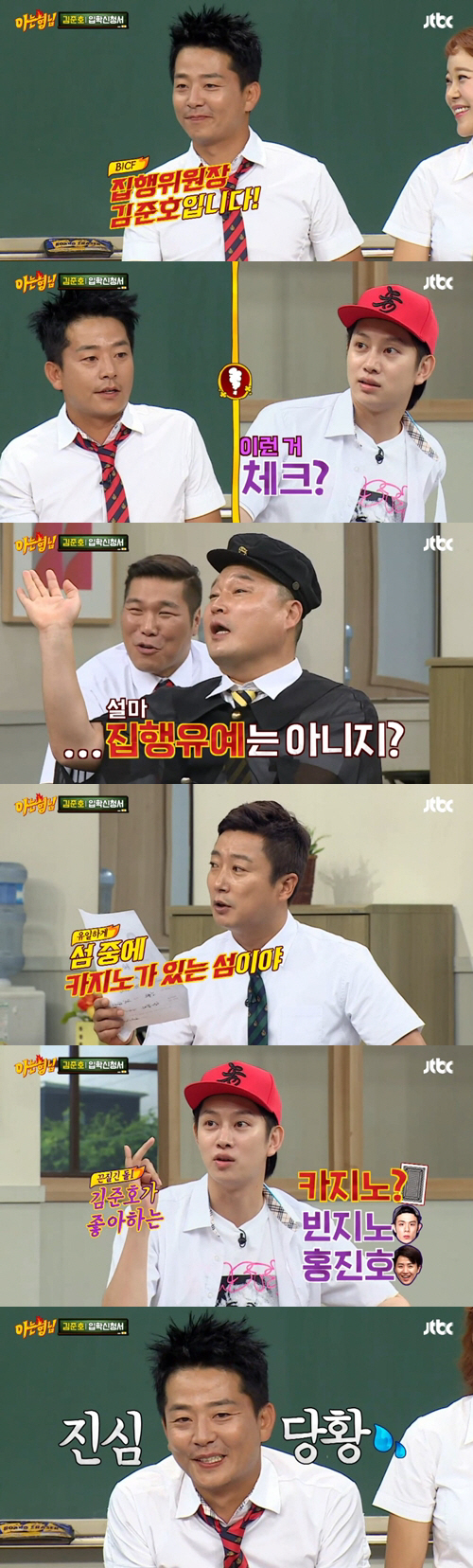 김준호는 "난 집행위원장으로서 여러 가지 체크를 한다"고 설명했지만, 김희철은 "체크? 다이? 이런 거 좋아하냐"며 도박 용어를 남발해 김준호를 당황케 했다. 여기에 강호동은 "집행유예는 아니지? 내 귀에는 집행유예로 들린다"고 도발해 웃음을 자아냈다.