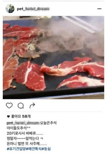 정씨는 과거 추석 명절을 맞아 자신이 기르고 있는 애견들에게 소고기 20kg을 사서 구워 먹인 사진을 올리기도 했다. 이에 누리꾼들은 "사람한테는 패드립하며 개한테는 사람 대접이라니 어처구니가 없다" "딸 인생 가로막기 작정하셨나요?" "눈살이 절로 찌푸려진다" "개들은 불쌍하고 눈물흘리며 도살장 끌려가는 소 생각은 안중에도 없나보네요" 등의 반응을 보이고 있다.