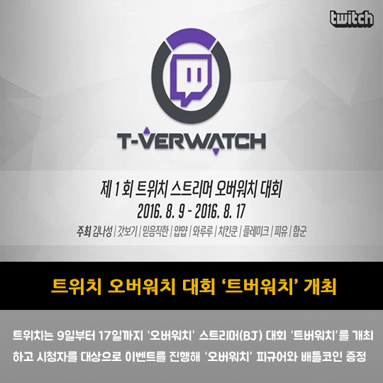 트위치는 9일부터 17일까지 '오버워치' 스트리머(BJ) 대회 '트버워치'를 개최 하고 시청자를 대상으로 이벤트를 진행해 '오버워치' 피규어와 배틀코인 증정