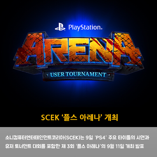 소니컴퓨터엔터테인먼트코리아(SCEK)는 9일 'PS4' 주요 타이틀의 시연과 유저 토너먼트 대회를 포함한 제 3회 '플스 아레나'의 9월 11일 개최 발표