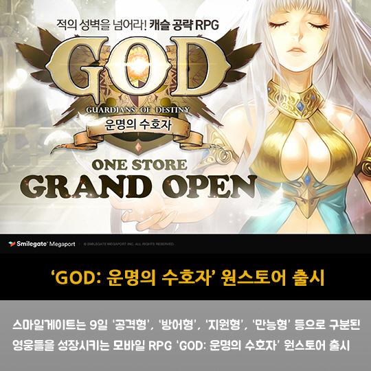스마일게이트는 9일 '공격형', '방어형', '지원형', '만능형' 등으로 구분된 영웅들을 성장시키는 모바일 RPG 'GOD: 운명의 수호자' 원스토어 출시