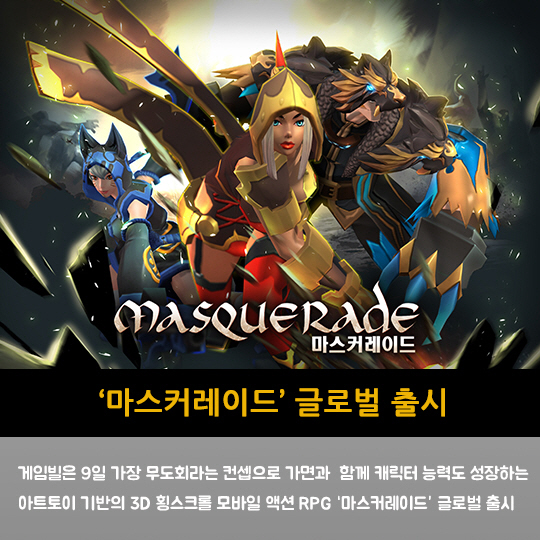 게임빌은 9일 가장 무도회라는 컨셉으로 가면과 함께 캐릭터 능력도 성장하는 아트토이 기반의 3D 횡스크롤 모바일 액션 RPG '마스커레이드' 글로벌 출시