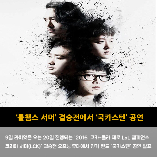9일 라이엇은 오는 20일 진행되는 '2016 코카-콜라 제로 LoL 챔피언스 코리아 서머(LCK)' 결승전 오프닝 무대에서 인기 밴드 '국카스텐' 공연 발표