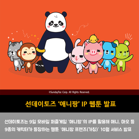 선데이토즈는 9일 모바일 퍼즐게임 '애니팡'의 IP를 활용해 애니, 마오 등 9종의 캐릭터가 등장하는 웹툰 '애니팡 프렌즈(가칭)' 10월 서비스 발표