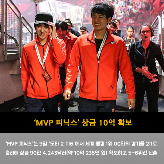 'MVP 피닉스'는 9일 '도타 2 TI6'에서 세계 랭킹 1위 OG와의 경기를 2:1로 승리해 상금 90만 4,243달러(약 10억 235만 원) 확보하고 5~6위전 진출