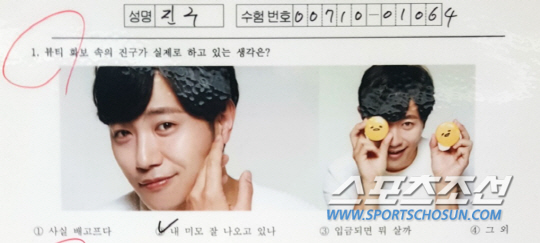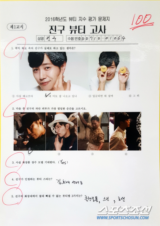 5번 문제. 진구의 화장대에서 절대 빠질 수 없는 뷰티템 3가지는 뭘까요. 정답은 클렌징폼-스킨-로션 정석 중의 정석이었습니다. 기본 아이템만으로도 이런 피부를 유지할 수 있는 게 놀라울 뿐입니다. 진구는 "정우씨는 하나로 통일한다지만..."이라며 친구인 배우 정우의 광고 CF를 따라하며 웃음을 자아낸 진구. 그는 유쾌함으로 그 어떤 때 보다 즐거운 뷰티 고사 시간을 만들어 주었습니다.
