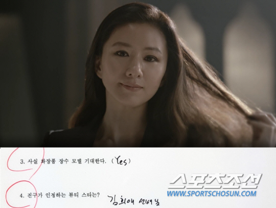 "김희애 선배님 처럼 장수하면 좋겠어요. 그전 까지 검은 피부는 화장품 모델로 인기가 없었어요. 근데 써주신 김에, 막상 써보니까 괜찮거든~ 사실 피부도 굉장히 좋은 편이에요. 그래서 인정하는 뷰티스타는 김희애 선생님. 내공은 못 이기죠."