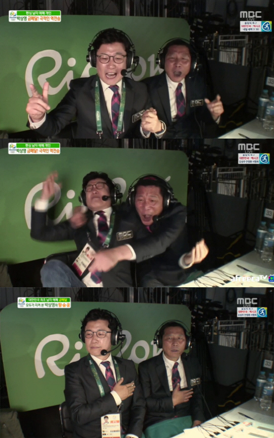 [스포츠조선 이유나 기자] 10일(한국시간) MBC '2016 리우올림픽' 펜싱 에페 남자 개인전에서 막내 박상영 선수가 극적 역전극으로 금메달을 목에 건 가운데 MBC 중계를 나선 김성주와 고낙춘 해설위원의 소박하지만 뭉클한 중계가 함께 관심 받고 있다.