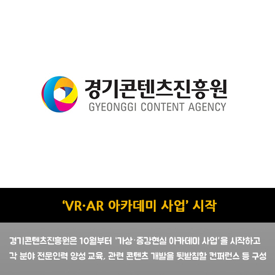 경기콘텐츠진흥원은 10월부터 '가상·증강현실 아카데미 사업'을 시작하고 각 분야 전문인력 양성 교육, 관련 콘텐츠 개발을 뒷받침할 컨퍼런스 등 구성