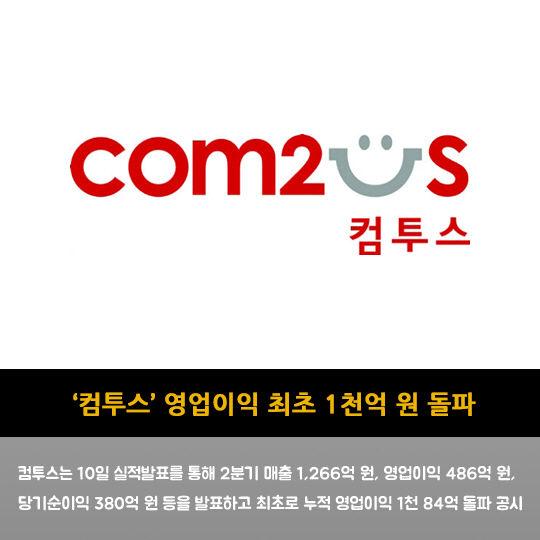 컴투스는 10일 실적발표를 통해 2분기 매출 1,266억 원, 영업이익 486억 원, 당기순이익 380억 원 등을 발표하고 최초로 누적 영업이익 1천 84억 돌파 공시