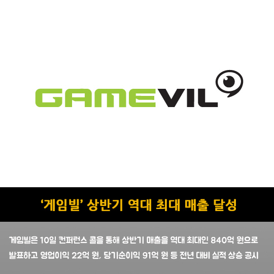 게임빌은 10일 컨퍼런스 콜을 통해 상반기 매출을 역대 최대인 840억 원으로 발표하고 영업이익 22억 원, 당기순이익 91억 원 등 전년 대비 실적 상승 공시