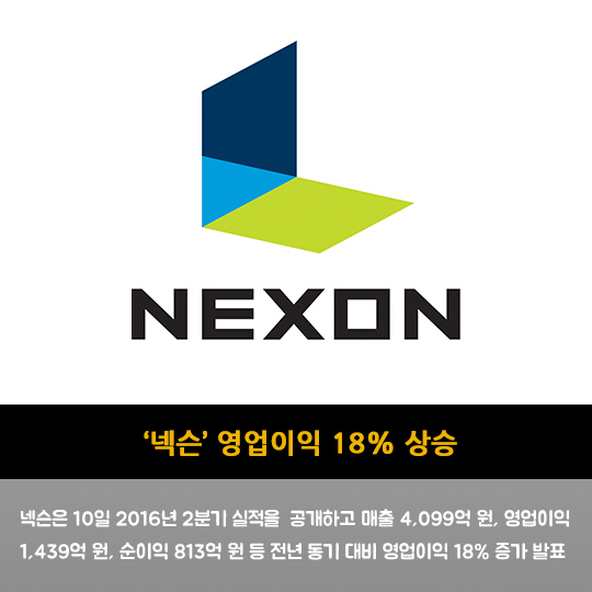 넥슨은 10일 2016년 2분기 실적을 공개하고 매출 4,099억 원, 영업이익 1,439억 원, 순이익 813억 원 등 전년 동기 대비 영업이익 18% 증가 발표