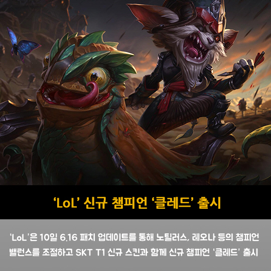 'LoL'은 10일 6.16 패치 업데이트를 통해 노틸러스, 레오나 등의 챔피언 밸런스를 조절하고 SKT T1 신규 스킨과 함께 신규 챔피언 '클레드' 출시