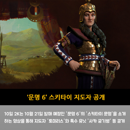 10일 2K는 10월 21일 발매 예정인 '문명 6'의 '스키타이 문명'을 소개 하는 영상을 통해 지도자 '토미리스'와 특수 유닛 '사카 궁기병' 등 공개