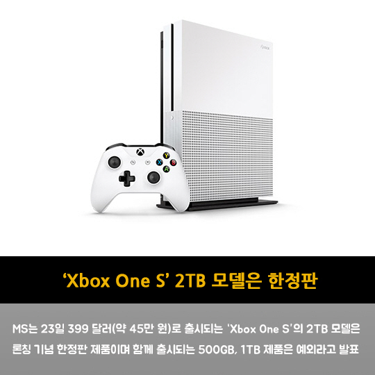 MS는 23일 399 달러(약 45만 원)로 출시되는 'Xbox One S'의 2TB 모델은 론칭 기념 한정판 제품이며 함께 출시되는 500GB, 1TB 제품은 예외라고 발표