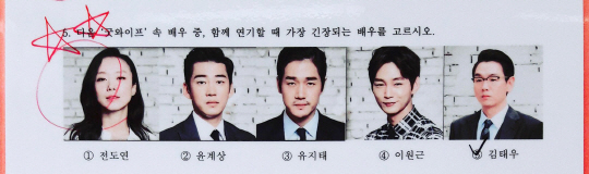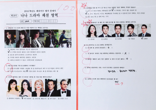 8번 문제. '솔직히 '예쁘다' 보다 '연기 잘한다' 는 말이 더 듣기 좋다.' 라는 말에는 망설임 없이 O를 썼습니다. 실력으로 인정받고 싶다는 솔직한 발언과 함께.