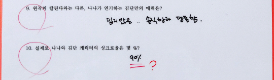 마지막입니다. 10번 문제. '실제로 나나와 김단 캐릭터의 싱크로율은 몇 % 인가?'에 대한 질문이었는데요. 이번에도 주저없이 답을 적었습니다.