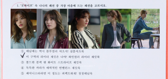 4번 문제. '오디션을 다섯 번 이나 볼 정도로 하고 싶었던 '김단' 캐릭터 무엇이 끌렸는가?' 를 묻는 문제였습니다. 나나는 문제가 문제인 만큼 지난 몇 개월 간을 함께 해 온 캐릭터이자 또 지금의 그녀를 있게 해준 캐릭터이기에 어느 하나를 선택하기 어렵다며 고심을 거듭했습니다. 4부 분량의 대본을 달달 외워 5번이나 오디션을 볼 정도로 캐릭터에 깊게 몰입했기 때문인 듯 합니다. 고심 끝에 고른 두 가지는 바로 2번 '누구에게도 기죽지 않는 불굴의 깡' 과 3번 '판, 검사, 변호사도 이기는 빠릿빠릿한 두뇌회전'.
