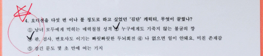 7번 문제. ''굿와이프' 속에서 가장 매력적인 캐릭터는 김단이다.' 라는 문장에는 X를 적었는데요. 김단이라는 인물이 정말 매력적이긴 한데 가장 매력적이라고 하기에는 드라마 속 캐릭터들이 너무 다양한 매력을 많이 가지고 있다네요.