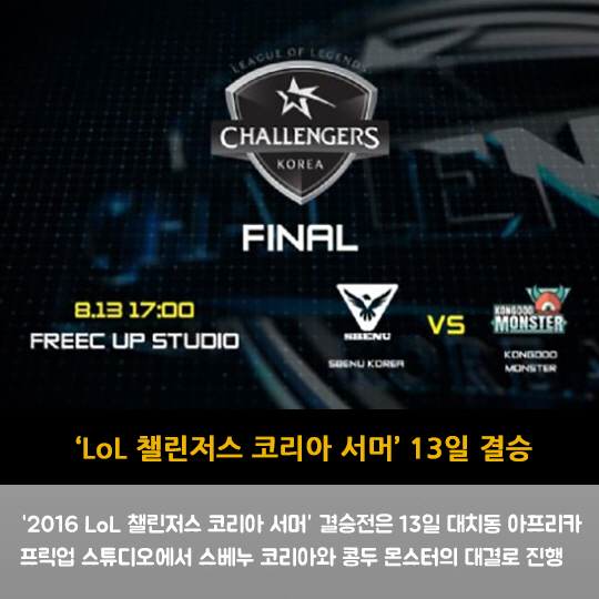 '2016 LoL 챌린저스 코리아 서머' 결승전은 13일 대치동 아프리카 프릭업 스튜디오에서 스베누 코리아와 콩두 몬스터의 대결로 진행