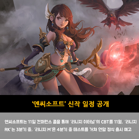 엔씨소프트는 11일 컨퍼런스 콜을 통해 '리니지 이터널'의 CBT를 11월, '리니지 RK'는 3분기 중, '리니지 M'은 4분기 중 테스트를 거쳐 연말 정식 출시 예고