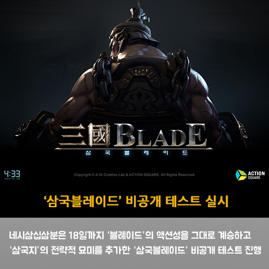네시삼십삼분은 18일까지 '블레이드'의 액션성을 그대로 계승하고 '삼국지'의 전략적 묘미를 추가한 '삼국블레이드' 비공개 테스트 진행