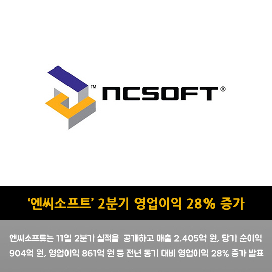 엔씨소프트는 11일 2분기 실적을 공개하고 매출 2,405억 원, 당기 순이익 904억 원, 영업이익 861억 원 등 전년 동기 대비 영업이익 28% 증가 발표