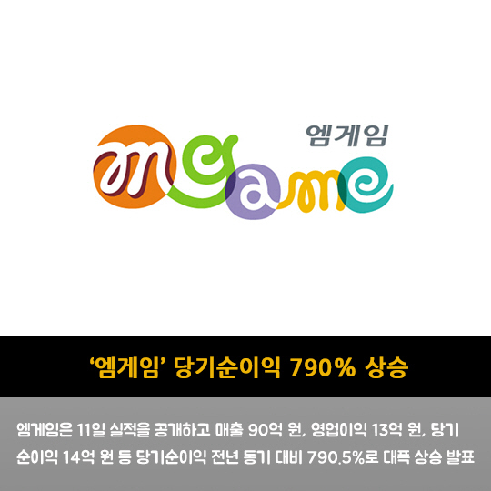 엠게임은 11일 실적을 공개하고 매출 90억 원, 영업이익 13억 원, 당기 순이익 14억 원 등 당기순이익 전년 동기 대비 790.5%로 대폭 상승 발표