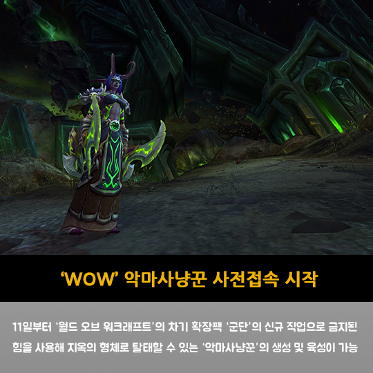 11일부터 '월드 오브 워크래프트'의 차기 확장팩 '군단'의 신규 직업으로 금지된 힘을 사용해 지옥의 형체로 탈태할 수 있는 '악마사냥꾼'의 생성 및 육성이 가능