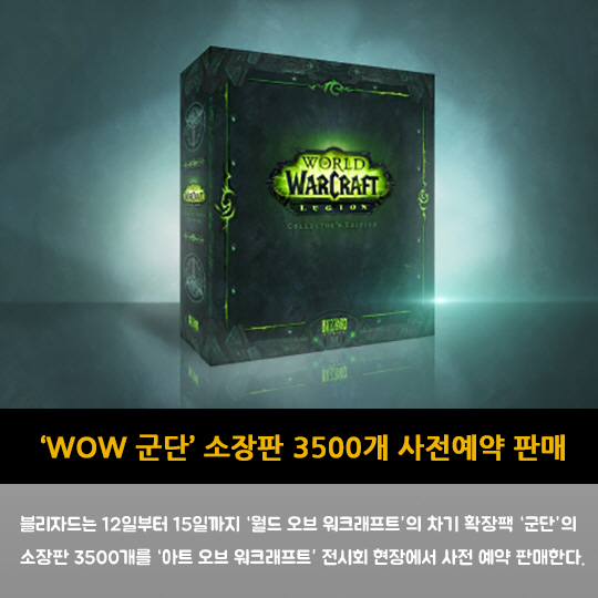 블리자드는 12일부터 15일까지 '월드 오브 워크래프트'의 차기 확장팩 '군단'의 소장판 3500개를 '아트 오브 워크래프트' 전시회 현장에서 사전 예약 판매한다.