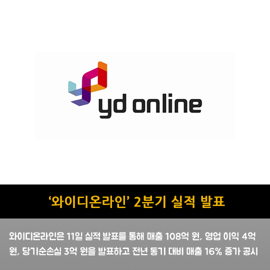 와이디온라인은 11일 실적 발표를 통해 매출 108억 원, 영업 이익 4억 원, 당기순손실 3억 원을 발표하고 전년 동기 대비 매출 16% 증가 공시