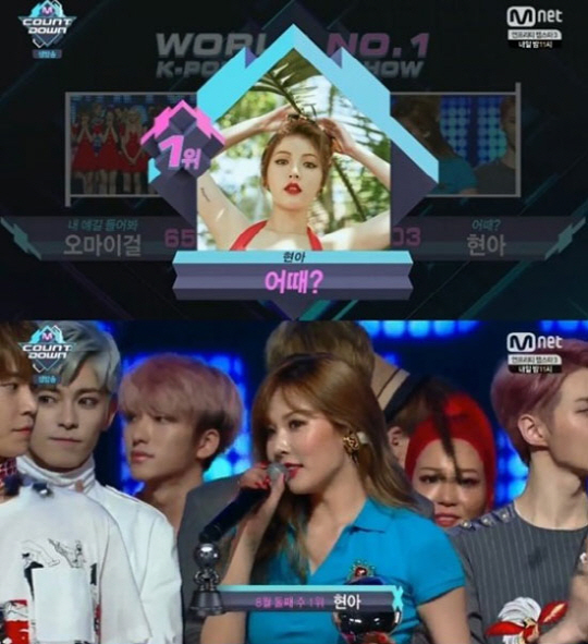 11일 방송된 Mnet '엠카운트다운'에서 현아가 컴백과 동시에 1위를 차지했다.