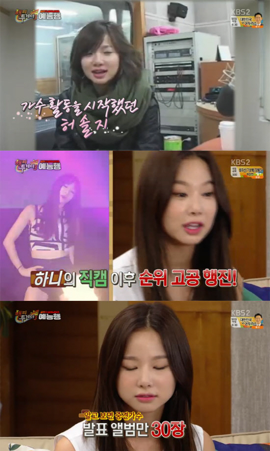 이에 걸그룹들은 모두 일어나 솔지에게 "선배님"을 외치며 인사했다. 솔지를 10여 년동안 버티게 한 건 남다른 가창력. 박명수는 "기획사도 대단하다. 23번 망했는데 계약을 하다니"라고 솔지를 놀려 웃음을 안겼다.