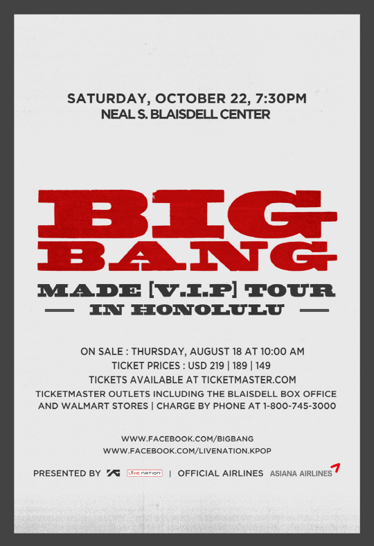 빅뱅은 앞서 지난 3월에 이어 6월, 7월 중국 선양, 포산, 난닝, 칭다오, 하얼빈, 다롄, 충칭, 청두 등에서 팬미팅을 개최, 11만여명의 팬들과 만난 바 있다. 당시 빅뱅은 전석 매진을 기록해 명불허전 '티켓 파워'를 과시한 바 있다. 하와이 팬미팅이 오는 19일 '티켓마스터'를 통해 티켓 판매를 시작하는 가운데 이 역시 치열한 티켓 예매 전쟁을 예고했다.