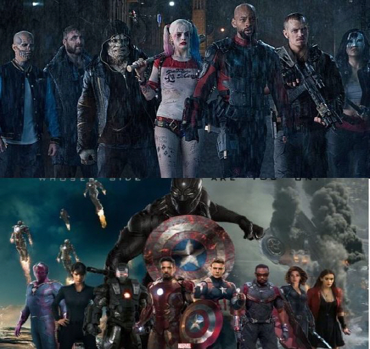 마블에 비해 한참 뒤쳐진 DC가 하루라도 빨리 많은 캐릭터를 출격시켜 마블 시네마틱 유니버스처럼 자신들만의 DC 세계관을 구축하려고 욕심을 부렸다. 그로 인해 '수어사이드 스쿼드'에는 메인 캐릭터만 7명이 등장한다. 개성강한 캐릭터들이 단체로 등장하는 것만 보면 마블의 히트작 '어벤져스'를 떠오르게 하지만 이야기를 풀어내는 방식은 '어벤져스'와 전혀 다르다.