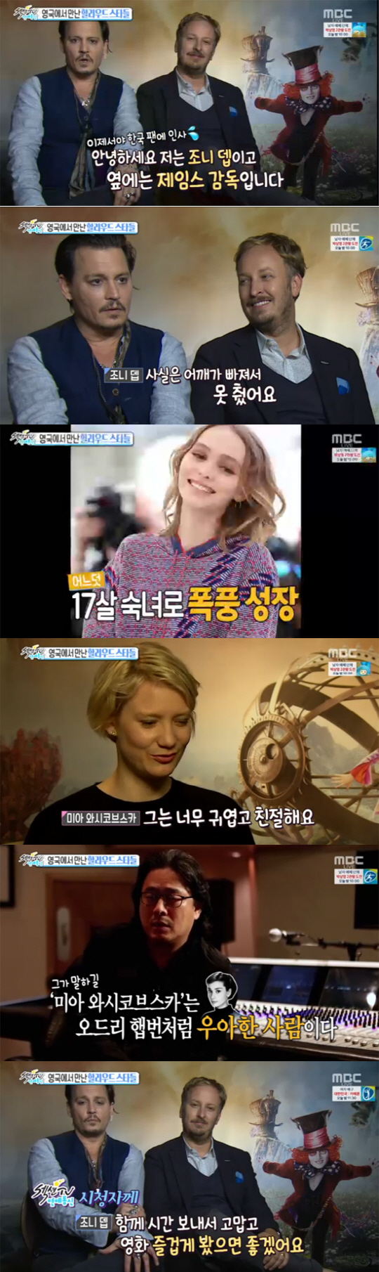 이날 방송에는 전편에서 독특한 비주얼로 인기를 끌었던 모자 장수 역의 조니 뎁과 한층 성숙해진 앨리스 역의 미아 와시코브스카 외에도 '시간' 캐릭터로 새롭게 합류한 사챠 바론 코헨 등이 출연해 '거울나라의 앨리스'의 한국 흥행을 기원했다.