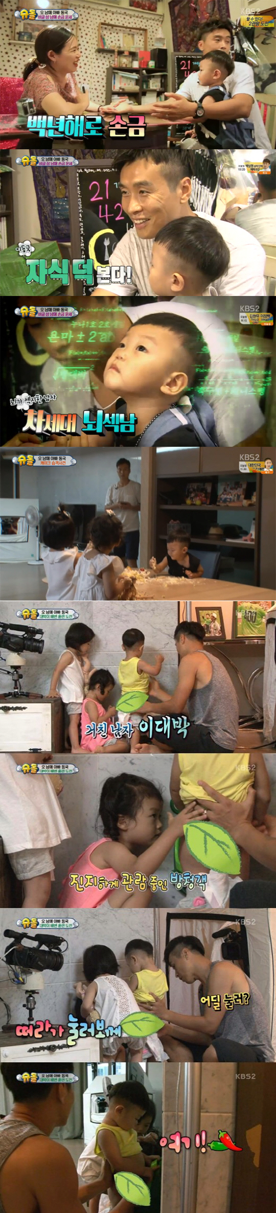 또한 이동국네 오남매 집에서는 대박이의 배변 훈련이 시작됐다. 대박이의 변기 실습에 설아 수아 남매도 힘을 모았다. 이어 시장을 나가 장을 보고 손금을 보러 간 이동국과 설아 수아 대박이 남매. 이동국은 '자식복이 있다'는 말에 웃음을 감추지 못했고, 대박이의 체력과 머리가 좋다는 손금에 행복해했다. 이어 이동국과 세 남매는 제시 제아의 생일파티를 치뤘다. 대박이는 5번째로 케이크를 기다리며 침샘을 폭발시켜 웃음을 유발했다. 그리고 아빠 이동국이 잠시 자리를 비운 사이 세 남매의 비글미가 폭발했다. 생일케이크는 식탁에 모두 펴 발라져 아빠 이동국의 멘붕을 초래했다.