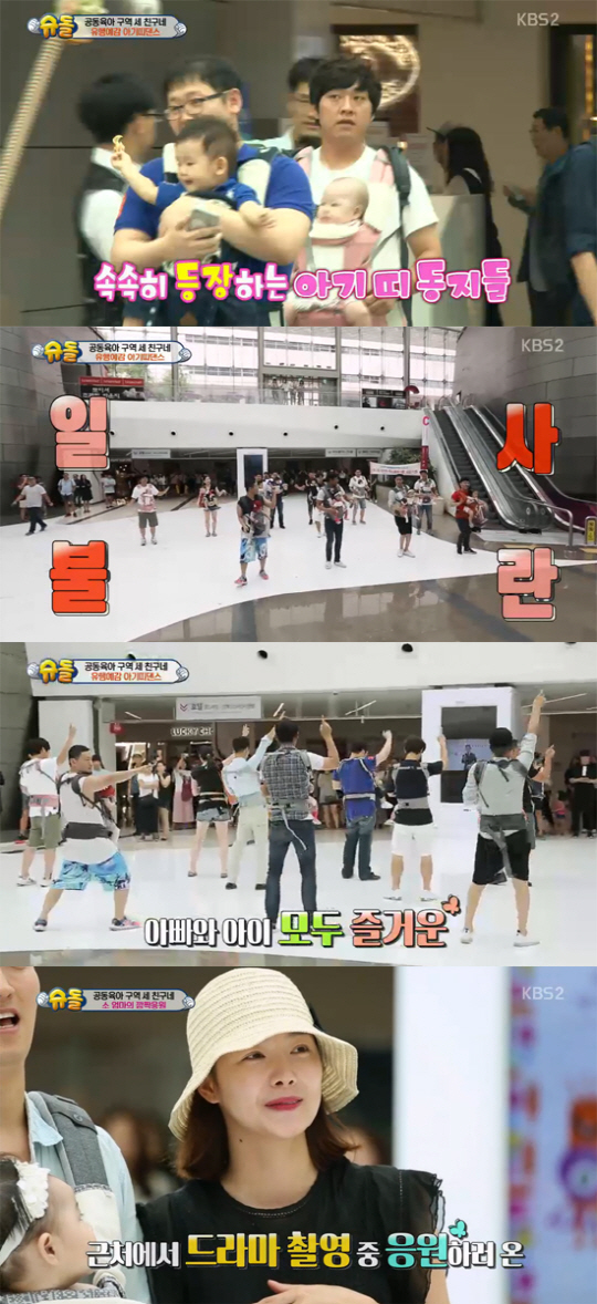 공동육아구역 아빠들은 특별한 이벤트를 준비했다. 바로 '아빠와 아기띠 플래시몹'. 시간이 되서 등장한 한 시내 쇼핑몰 광장에는 속속들이 아기띠를 맨 아빠들이 등장했고, 어느새 그룹으로 단체 댄스를 선보였다. 또 한명의 깜짝 손님은 배우 소이현. 근처에서 드라마 촬영중에 남편 인교진과 딸을 보러 등장해 반가움을 더했다.