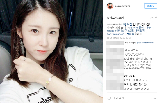 이날 시크릿 전효성은 자신의 인스타그램을 통해 "#광복절 입니다 감사합니다 잊지않겠습니다 #위안부할머니후원 #hope #애니휴먼 #희망나비팔찌 #anyhumans #나눔의집"이라는 글과 함께 사진 한장을 올렸다.