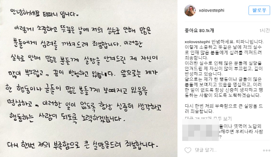 이에 티파니도 15일 자신의 인스타그램에 사과문까지 게재했다. 그는 자신의 인스타그램에 "안녕하세요 티파니입니다. 이렇게 소중하고 뜻깊은 날에 저의 실수로 인해 많은 분들에게 심려를 끼쳐드려서 죄송합니다"라고 사과했다.