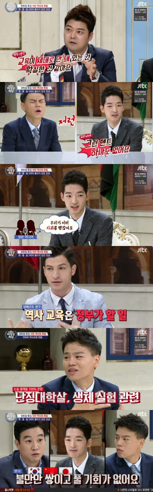 이를 들은 전현무는 "정확한 내용 전달 없이 미디어로 특정 부분만 강조해서 일본인들이 더 관심을 갖지 않는 것 같다"며 일본의 역사 교육이 제대로 되지 않은 건 확실한 것 같다"고 일침했다. 그러자 오오기는 "젊은 사람들이 역사를 좀 더 배워야 한다고 생각한다"고 말했고, 알베르토는 "일본 젊은 사람들의 탓이 아니다. 역사 교육은 정부가 할 일이다. 젊은 사람들은 학교에서 안 가르쳐주면 관심이 없다"고 지적했다.