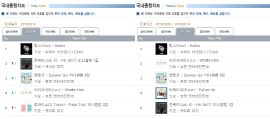 [스포츠조선닷컴 김영록 기자]빅스의 6번째 싱글 앨범 '하데스(Hades)'가 각종 차트를 휩쓸고 있다.