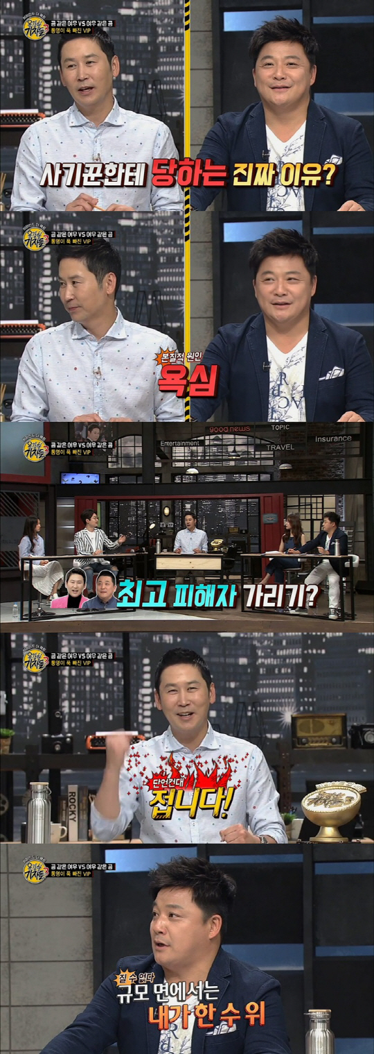 두 사람의 모습을 유심히 관찰하던 김태현은 "조금만 알아보면 사기라는 걸 알 수 있는데 왜 당하는 거냐"고 물었다. 이에 신동엽과 윤정수는 "모든 게 욕심 때문에 눈이 멀게 되는 거다"고 입을 모았다.