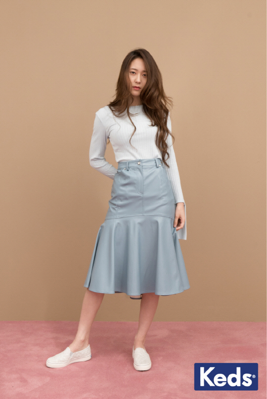 시크하면서도 부드러운, 두가지 감성을 동시에 전달하는 룩이다. 크리스탈의 시크함을 한층 업데이트 시킨 소재의 변화를 주목해보면 좋다. 올 가을을 트렌디하게 보낼 수 있는 키 아이템으로 이런 파스텔 톤의 가죽 아이템이 많이 보일 전망이다. 특히 니트 아이템과의 믹스해보면 새로운 분위기를 더할 수 있다. 크리스탈은 슬림한 핏의 리브 니트와 머메이드 가죽 스커트를 선택해, 페일 블루의 톤 온 톤 스타일링으로 여성스럽게 연출했다. 여기에 내추럴한 감성을 살리고 싶다면 크리스탈처럼 기본 슬립온을 더해보면 될 듯
