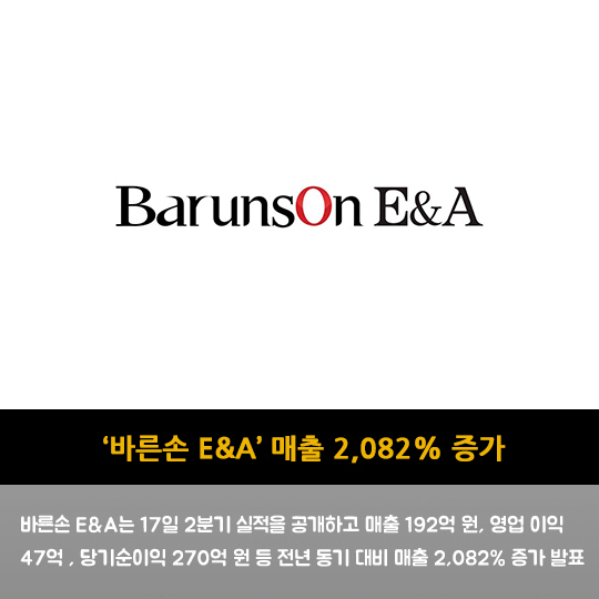 바른손 E&A는 17일 2분기 실적을 공개하고 매출 192억 원, 영업 이익 47억 , 당기순이익 270억 원 등 전년 동기 대비 매출 2,082% 증가 발표