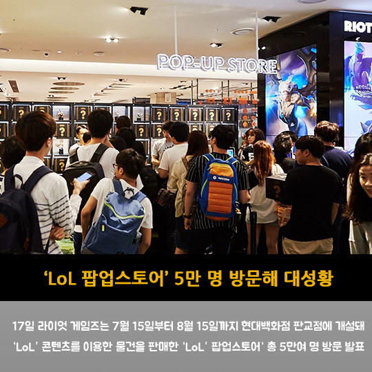17일 라이엇 게임즈는 7월 15일부터 8월 15일까지 현대백화점 판교점에 개설돼 'LoL' 콘텐츠를 이용한 물건을 판매한 'LoL' 팝업스토어' 총 5만여 명 방문 발표