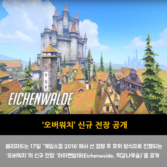 블리자드는 17일 '게임스컴 2016'에서 선 점령 후 호위 방식으로 진행되는 '오버워치'의 신규 전장 '아이헨발데(Eichenwalde, 떡갈나무숲)'을 공개
