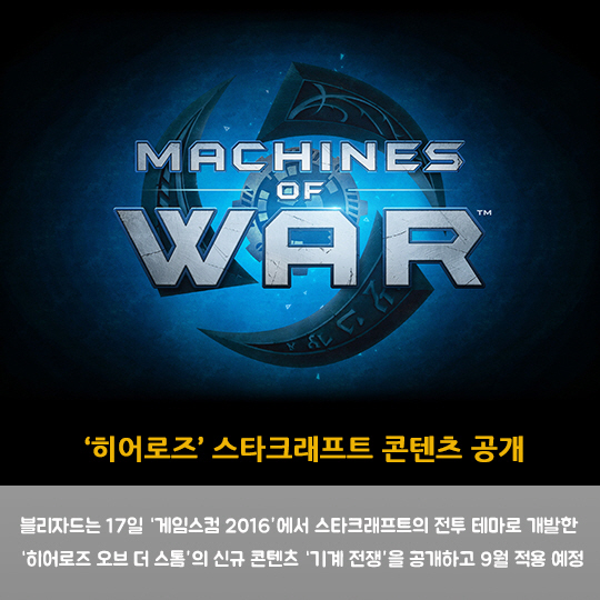 블리자드는 17일 '게임스컴 2016'에서 스타크래프트의 전투 테마로 개발한 '히어로즈 오브 더 스톰'의 신규 콘텐츠 '기계 전쟁'을 공개하고 9월 적용 예정