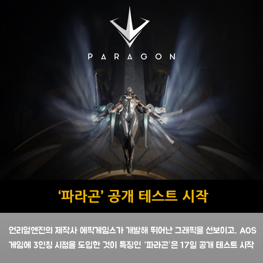 언리얼엔진의 제작사 에픽게임스가 개발해 뛰어난 그래픽을 선보이고, AOS 게임에 3인칭 시점을 도입한 것이 특징인 '파라곤'은 17일 공개 테스트 시작