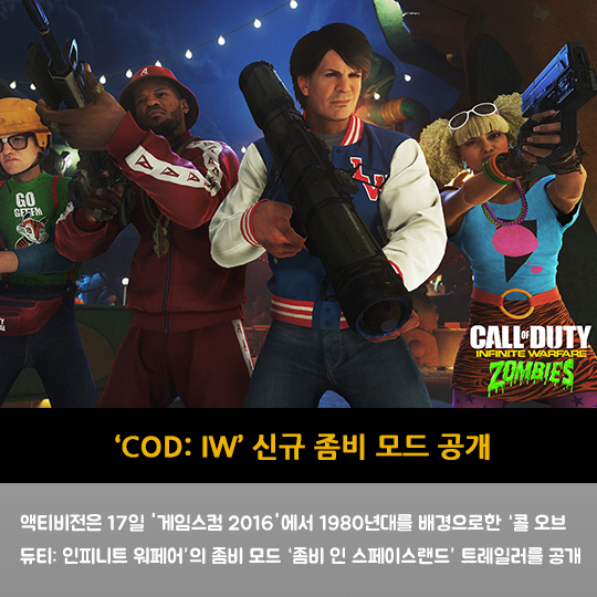 액티비전은 17일 '게임스컴 2016'에서 1980년대를 배경으로한 '콜 오브 듀티: 인피니트 워페어'의 좀비 모드 '좀비 인 스페이스랜드' 트레일러를 공개